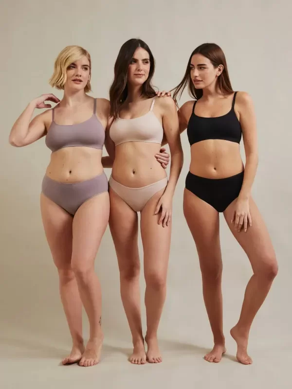 El pack x3 esta integrado por bombacha vedetina color arena, mocka y negro / macchiato, cedro, avellana