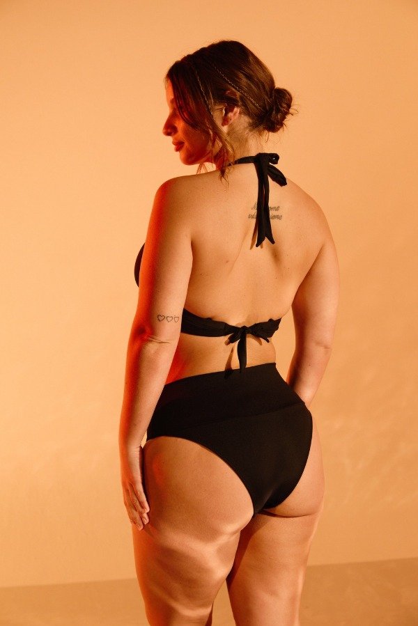 El tiro corto alto con frunce delantero estiliza la figura y realza las curvas de manera natural.