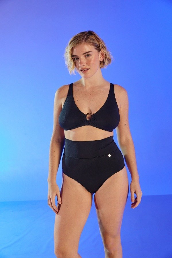 El soutien con hebilla en el centro realza el busto con un toque sofisticado, mientras que la bombacha alta con cintura rebatible ofrece versatilidad y un calce perfecto para todo tipo de cuerpo.