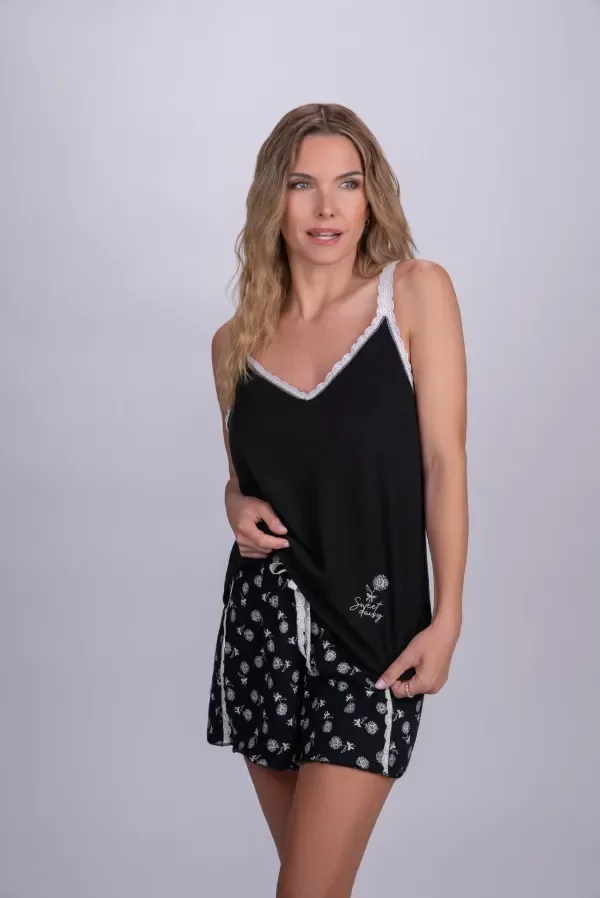 Este pijama de musculosa espalda completa, confeccionado en una tela suave y ligera que se complementa con un short estampado combinando con el tono de la musculosa.