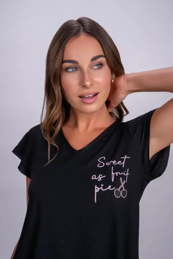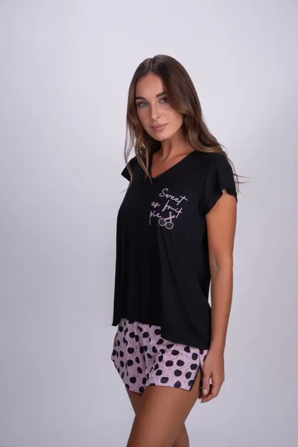 El pijama combina comodidad y estilo, la remera liviana y suave se complementa con un short en color verde pistacho pastel, con estampa de cerezas en tono natural y sutiles destellos de brillo que le aportan un aire femenino y delicado.